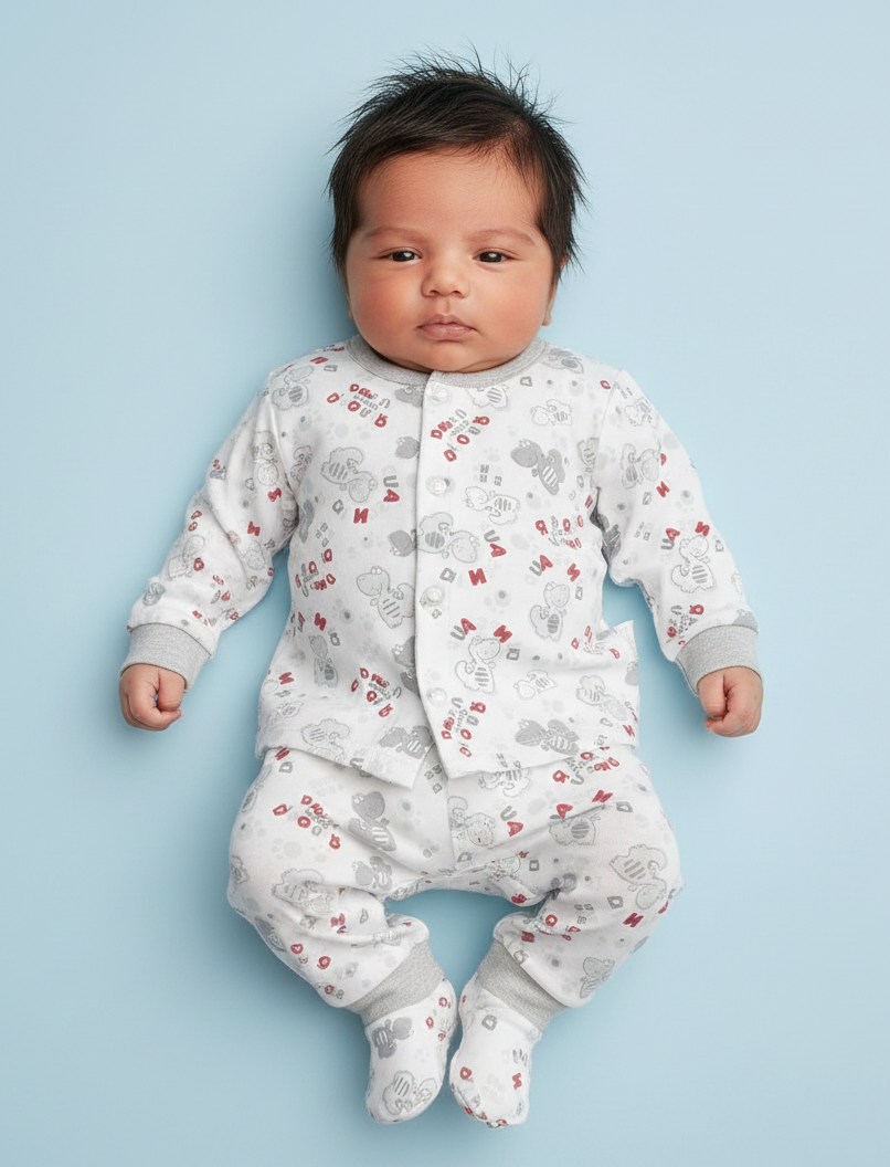 Its calming neutral palette pairs beautifully with minimalist design, making it ideal for both lounging and sleepwear. The flexible fit ensures your baby stays comfortable throughout the day, while the durable stitching allows repeated washing without losing softness.